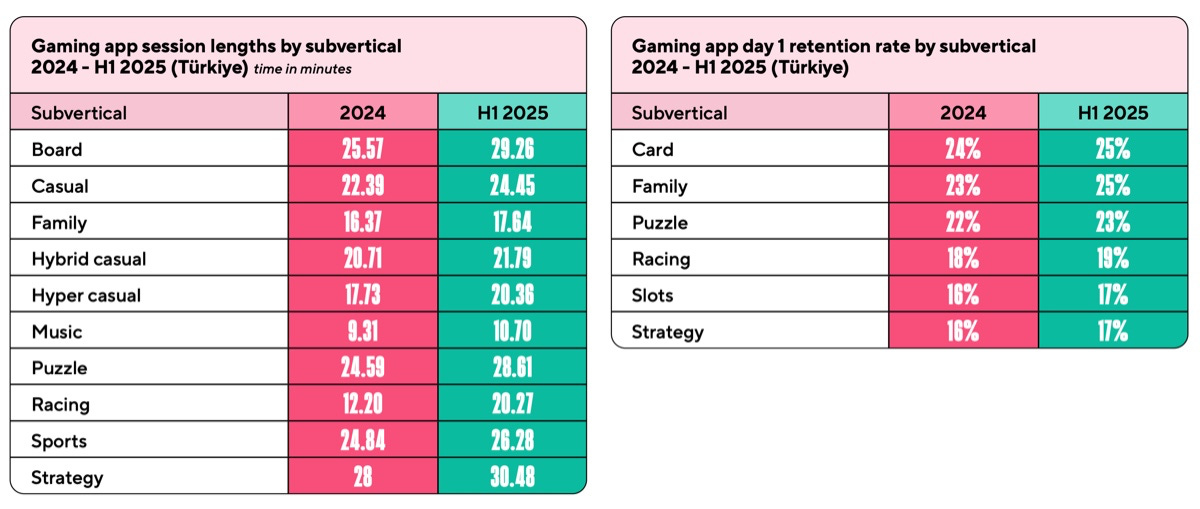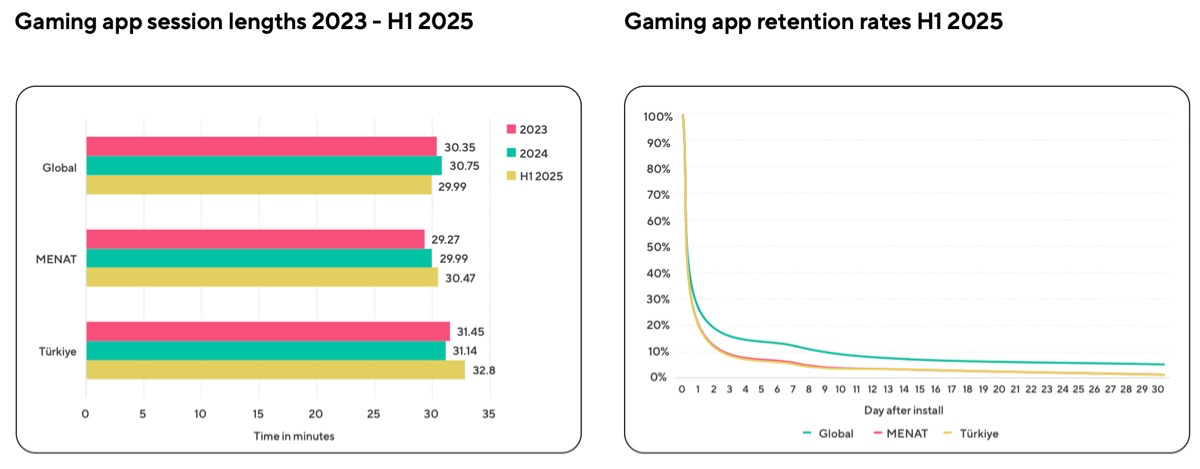 Retention rates in Turkey during H1 2025 were: D1 – 19%, D7 – 5%, D14 – 3%, D30 – 1%. By comparison, global benchmarks are D1 – 26%, D7 – 12%, and D30 – 5%. In other words, games in Turkey retain players less effectively than the global average.