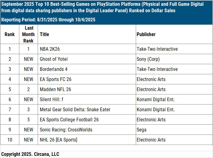 September saw a number of notable releases: EA Sports FC 26 (#3), Ghost of Yotei (#4), Silent Hill: f (#7), Sonic Racing: CrossWorlds (#8), Final Fantasy Tactics: The Ivalice Chronicles (#9), NHL 26 (#12), Digimon Story: Time Stranger (#13), and Super Mario Galaxy + Super Mario Galaxy 2 (the compilation reached #14, excluding physical sales).