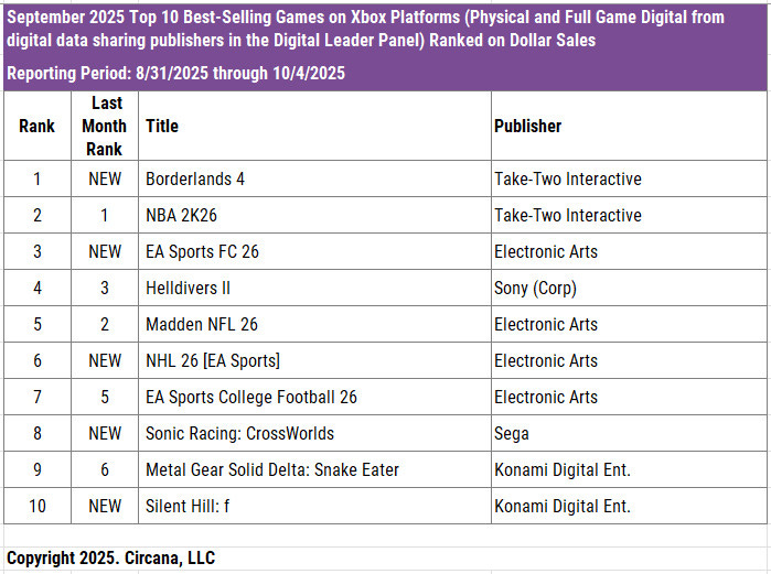 Among September’s new releases, Borderlands 4 immediately became the third best-selling game of 2025 year-to-date in the U.S. EA Sports FC 26 ranked #15 overall, and Ghost of Yotei came in at #18.
