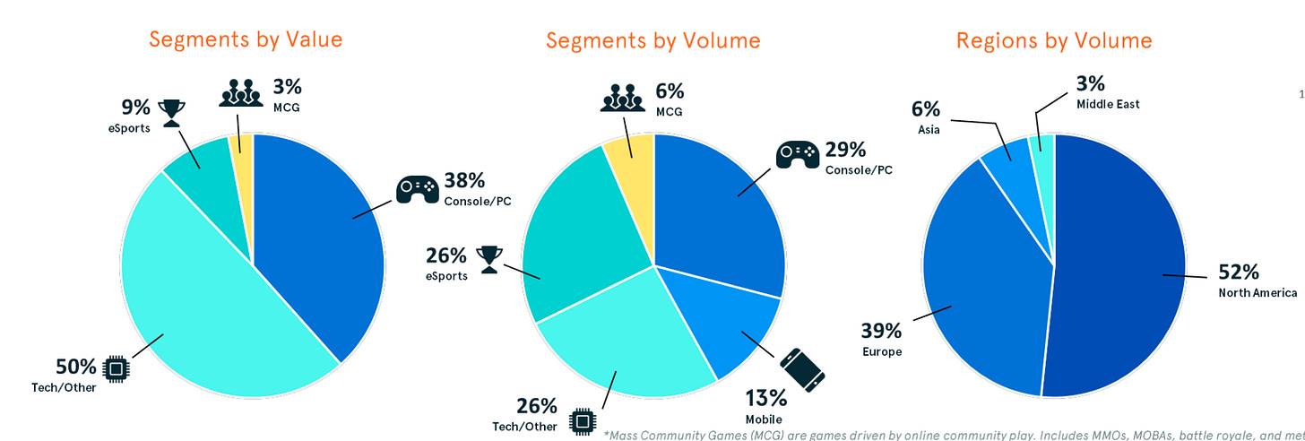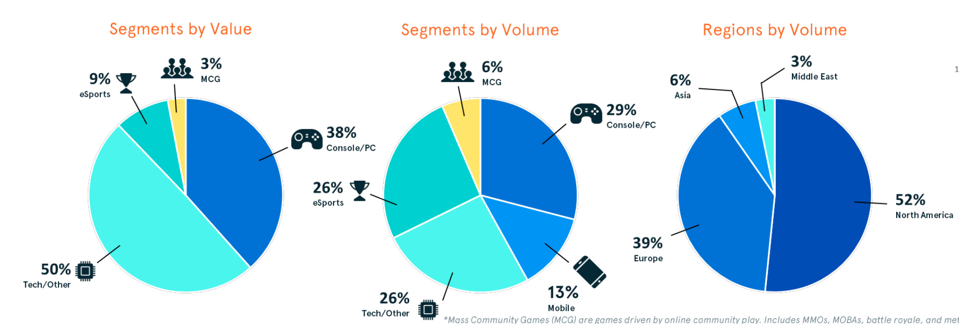 The largest disclosed deals of the quarter were the acquisition of Wargraphs ($53.6 million - analytical service); Night Dive Studios ($19.5 million - developer); Hardsuit Labs (developer and service provider).