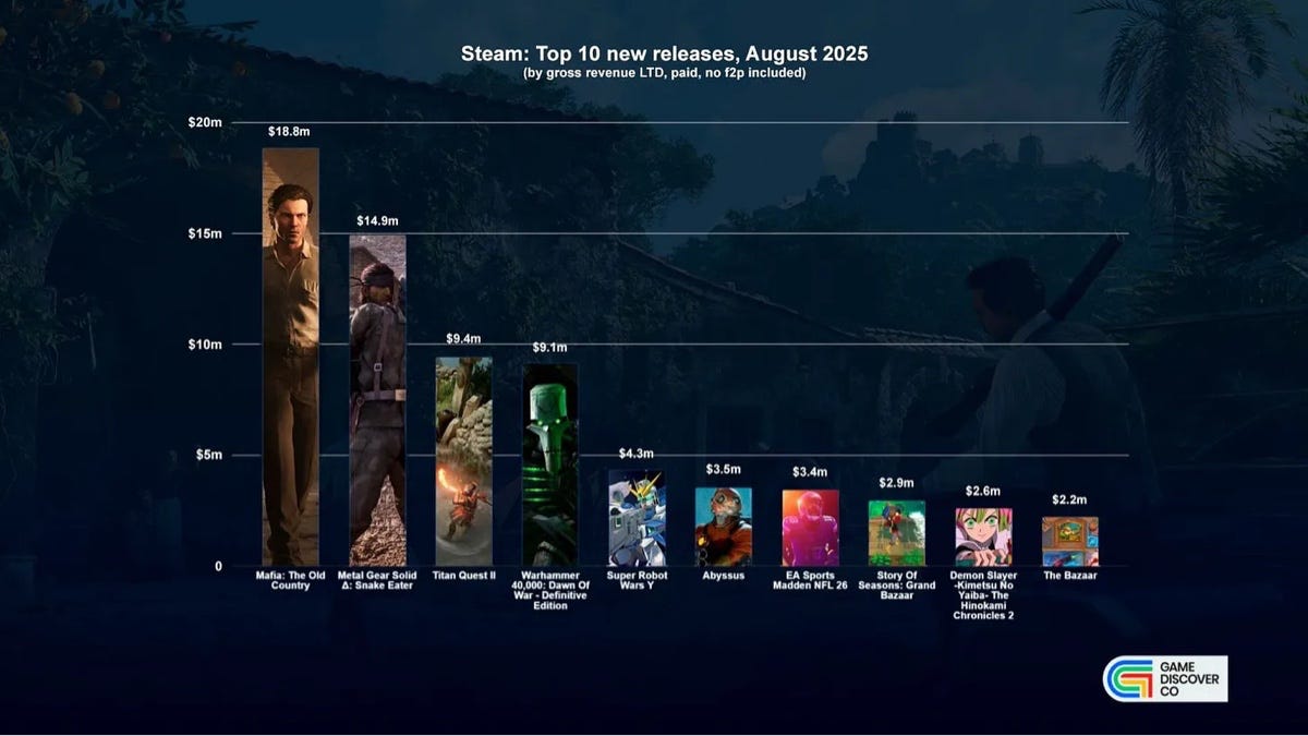 Unsurprisingly, the expensive projects (Mafia: The Old Country - $18.8M Gross Revenue; Metal Gear Solid Delta: Snake Eater - $14.9M Gross Revenue) and Titan Quest II ($9.4M Gross Revenue) took the top spots.