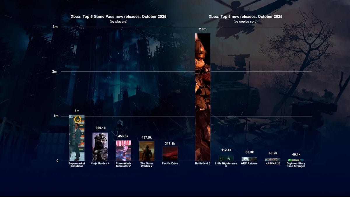 Top new Game Pass titles included Supermarket Simulator (+1M players), Ninja Gaiden 4 (+650K), and PowerWash Simulator 2 (+453.6K).