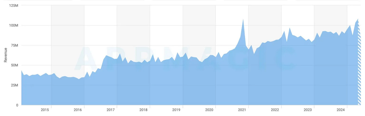 Candy Crush Saga posted its second-highest monthly revenue ever in April 2025. The game made $108.25 million after taxes and fees. The only higher month was October 2021, by $38,000. Numbers from AppMagic.