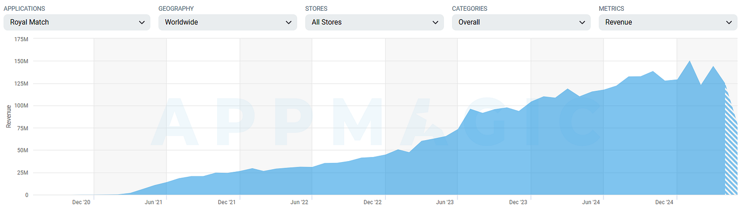 AppMagic reports that players have already spent over $6 billion (Gross) in Royal Match. The US accounts for 54.5% of all revenue. Since launch, the game has been downloaded over 351 million times.
