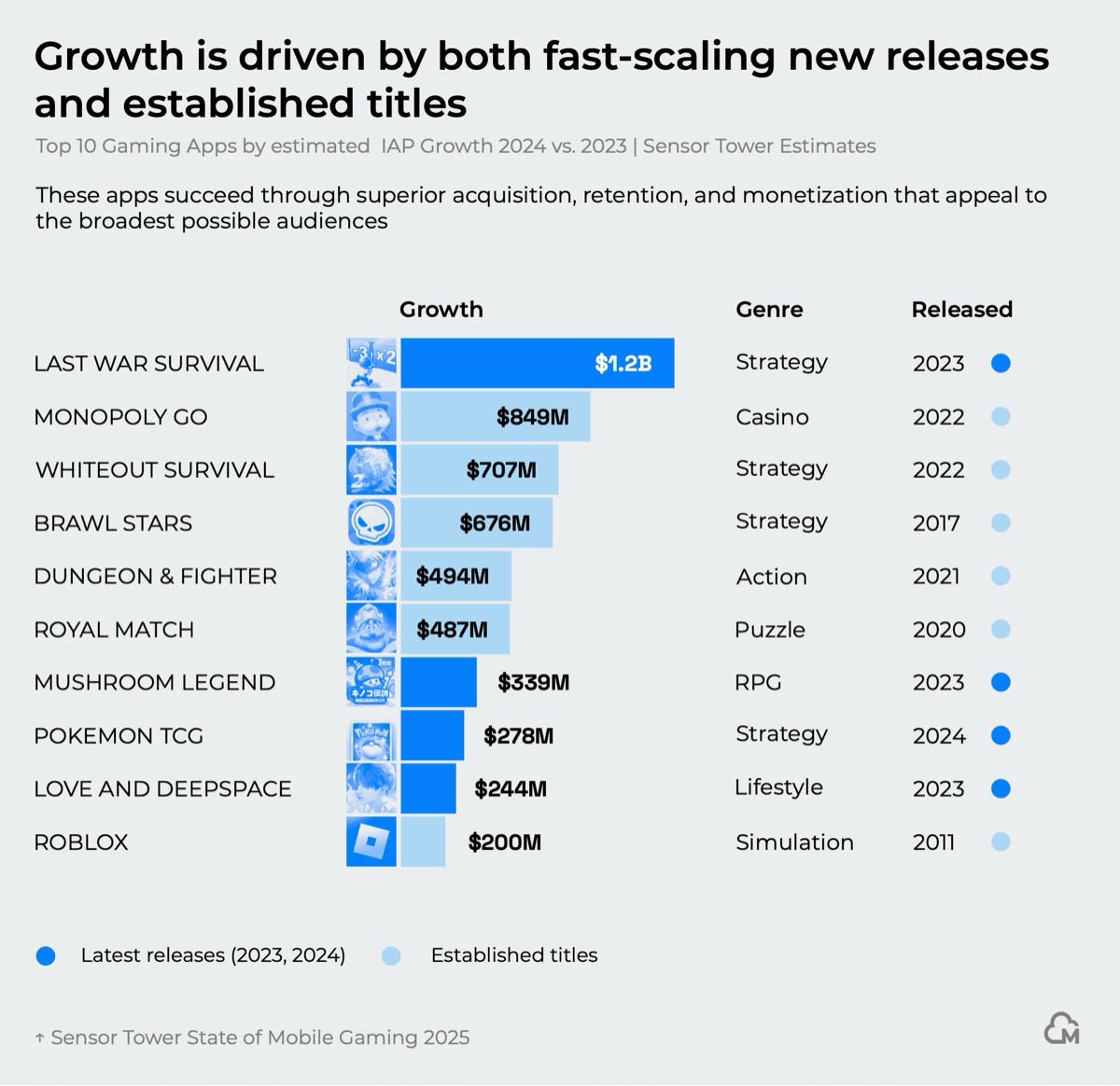 The strongest revenue growth in 2024 came both from new launches (Last War Survival, Mushroom Legend, Pokemon TCG, Love and Deepspace) and established hits (Monopoly Go, Whiteout Survival, Brawl Stars, Dungeon & Fighter, Royal Match, Roblox).