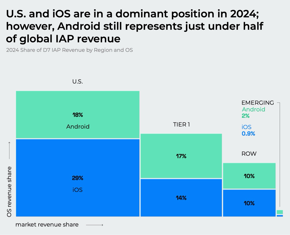 In revenue, iOS has long outperformed Android. In 2024, Apple’s platform grew by 10%, while Android slipped 2%.