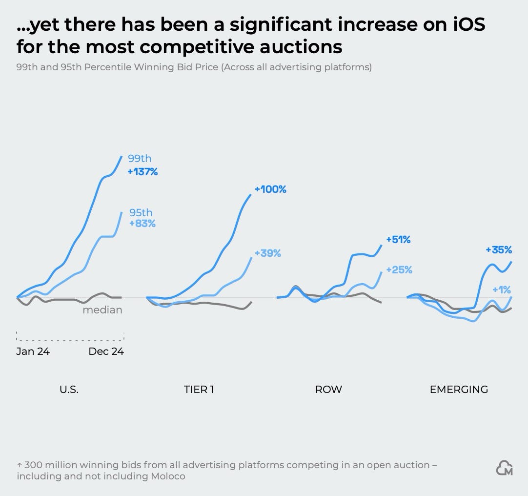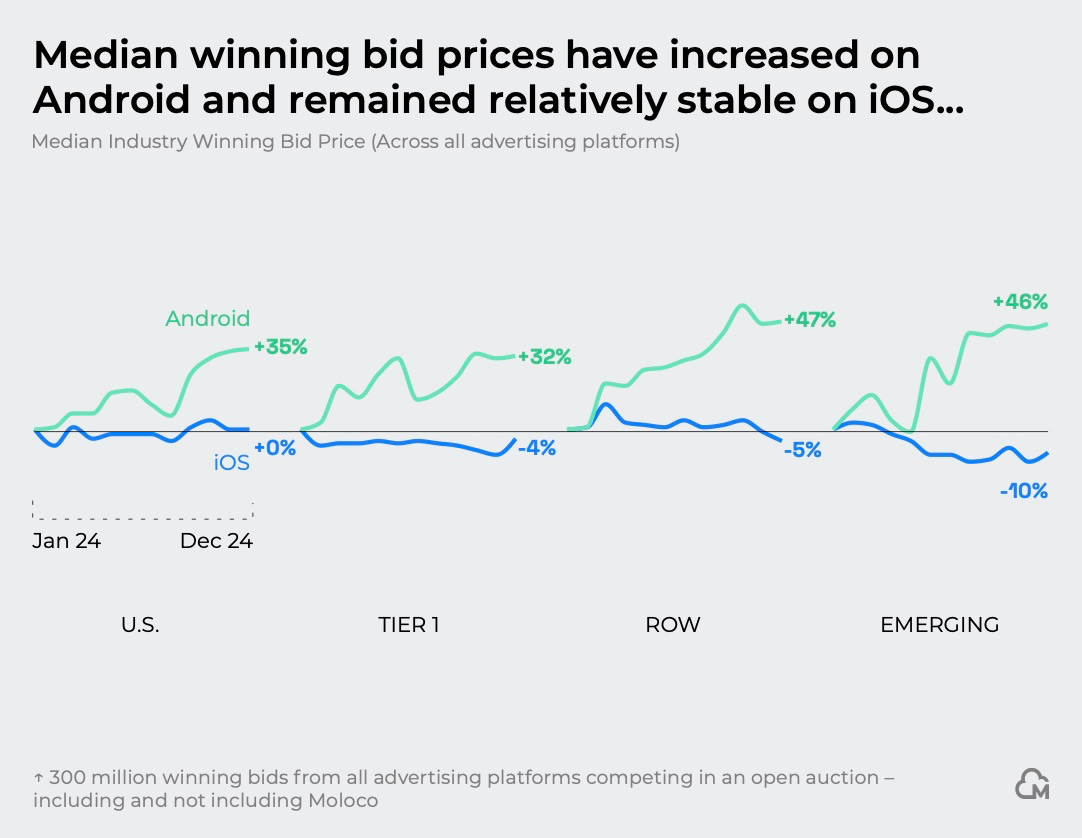 Auction competition on Android rose sharply in 2024. Median winning bids in Tier-1 increased 32%, and as much as 47% in RoW regions.