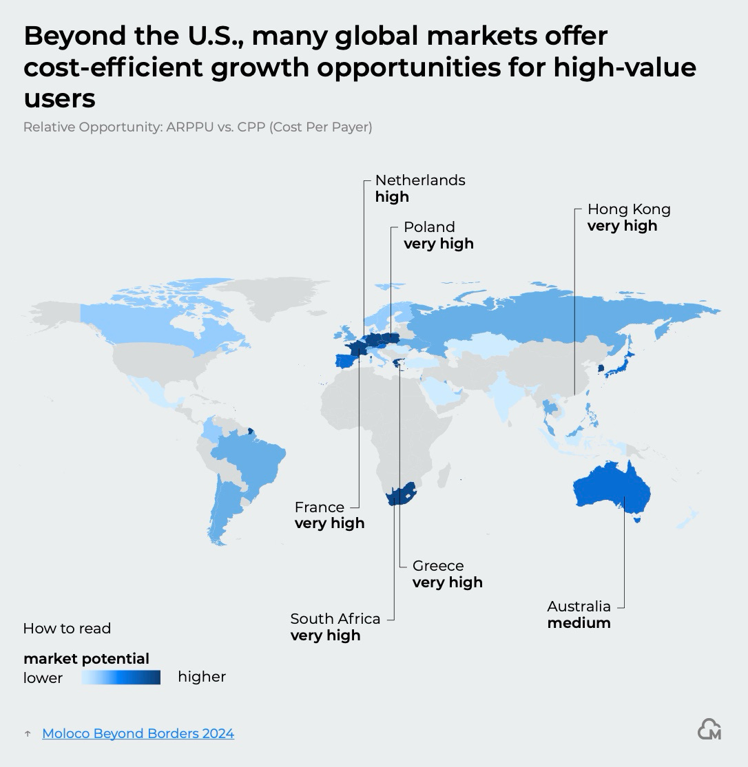 Moloco notes that with rising competition, many companies are shifting budgets to other regions. Poland, France, Greece, South Africa, and Hong Kong are highlighted as high-potential markets, based on ARPPU-to-CPP ratios (Cost Per Payer).