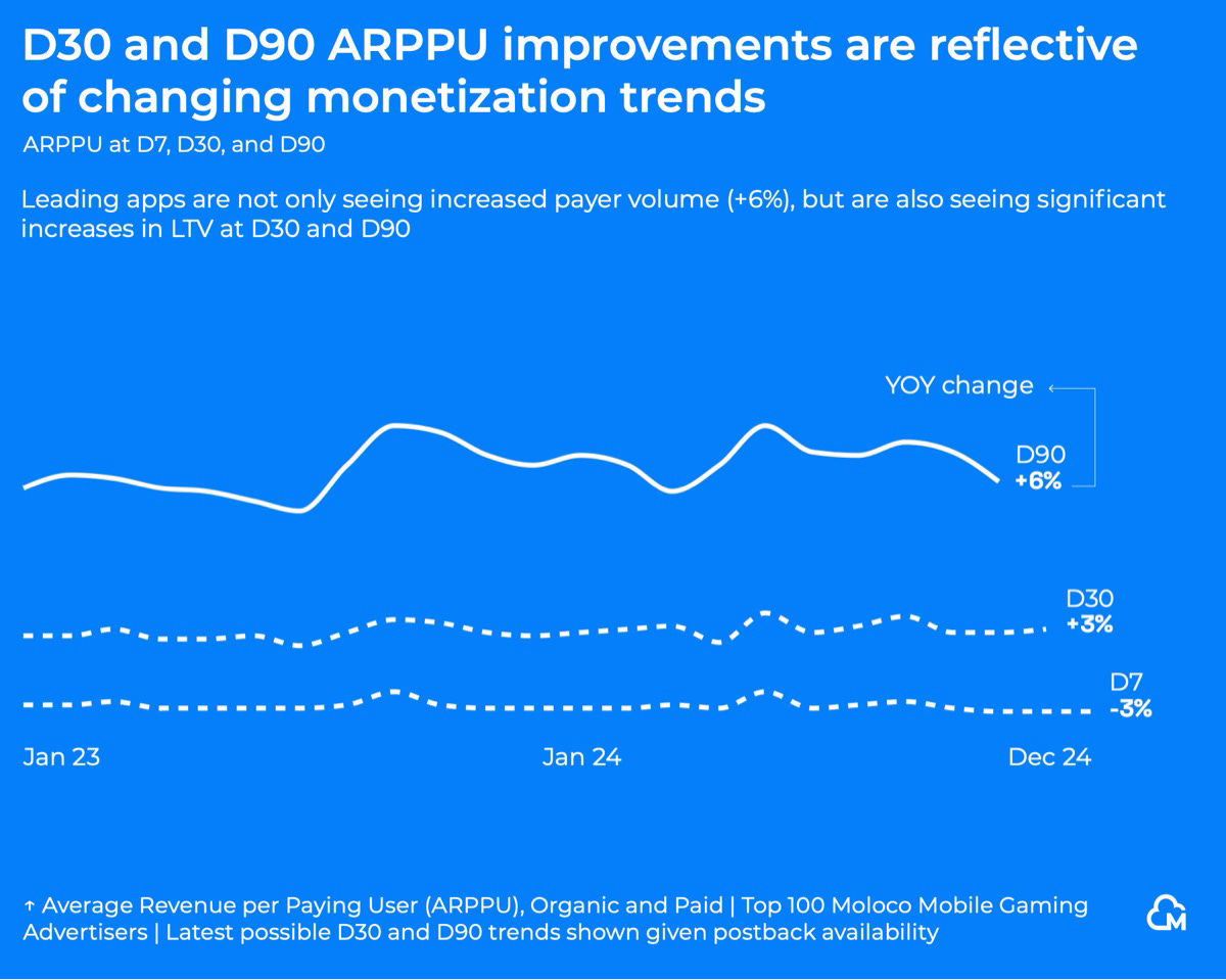 D7 ARPPU fell 3% YoY in 2024. But D30 ARPPU rose 3% YoY, while D90 ARPPU jumped 6%.