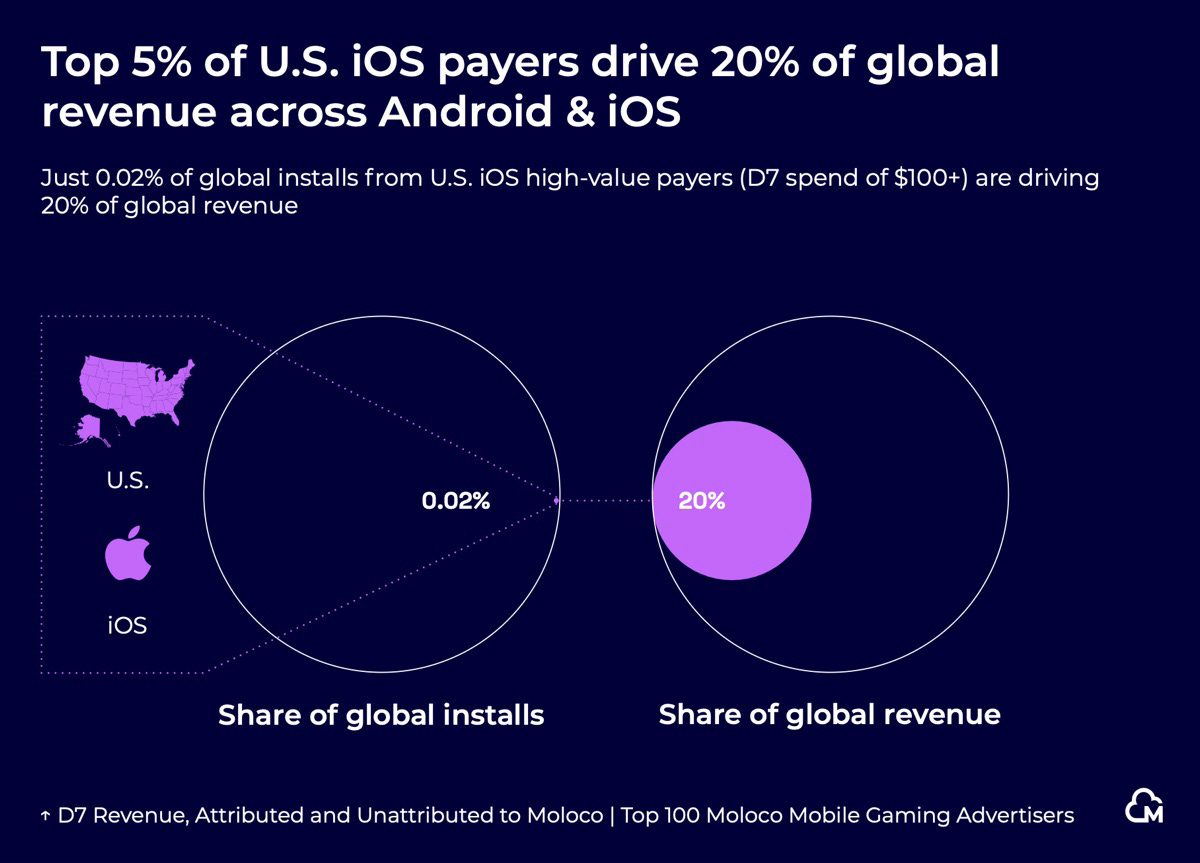 The top 5% of iOS users in the US generate 20% of the entire gaming IAP market. They represent just 0.02% of total installs in the country. These users typically spend over $100 by D7.