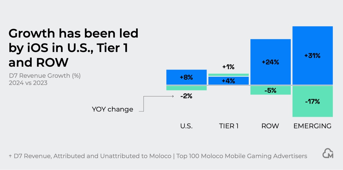 iOS growth was driven mainly by the US (+11% YoY) and RoW countries (+19% YoY). Emerging markets grew 39% in payers, but their revenue share remains small.