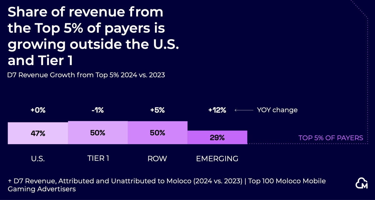 The share of “whales” in global revenue is growing, especially in emerging markets (+12% YoY) and RoW regions (+5% YoY).