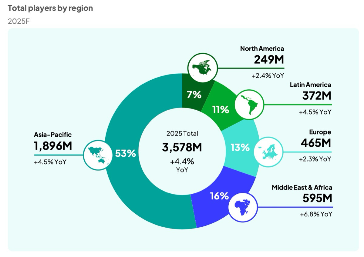 53% of all players are in Asia-Pacific. Fastest growth comes from MENA (+6.8% YoY). Latin America’s growth is mainly driven by mobile and PC.