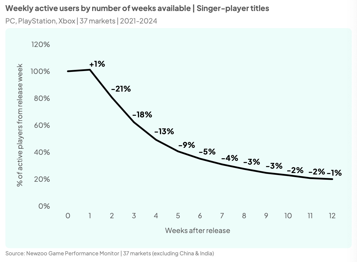 Player interest in new single-player games typically lasts 1–2 weeks. After that, engagement drops sharply (around –60% by week 5). Post week 12, retention declines at –1% per week. Metrics are based on % of active launch-week audience remaining.