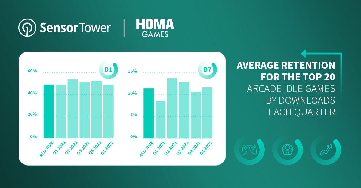 Arcade Idle games from the top 20 (WW) are showing D1 Retention between 48% and 52%. Day 7 varies from 7% to 13%.
