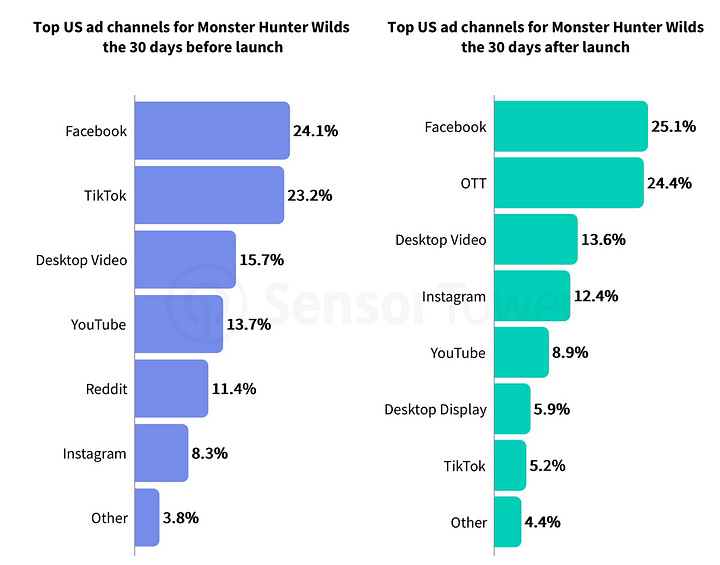 In marketing, Monster Hunter Wilds ramped up US advertising about a month before launch, shifting from TikTok/Reddit pre-launch to OTT post-launch, with ads focused on epic gameplay showcases.