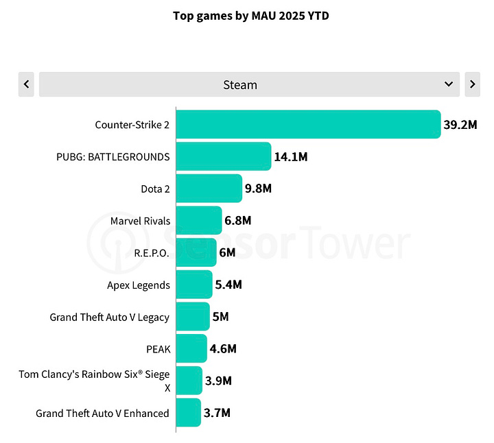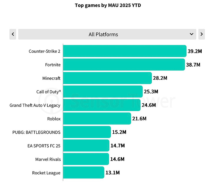 By MAU, the leaders were Counter-Strike 2 (39.2M), Fortnite (38.7M), and Minecraft (28.2M).