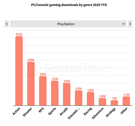 Among AAA games, sports titles (EA Sports FC, NBA 2K, UFC), racing (Forza, Need for Speed, F1), and shooters lead in average downloads.