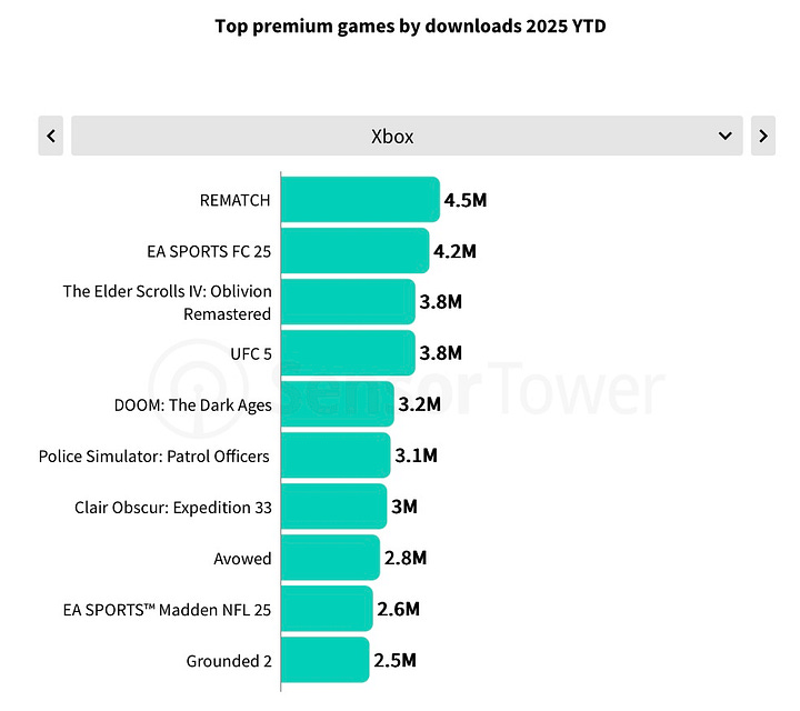 ❗️There may be a mistake in the chart: for example, Clair Obscur: Expedition 33 had sold 4.4 million copies by September 15. The graph likely counts Xbox Game Pass downloads, meaning it shows overall downloads, not sales.