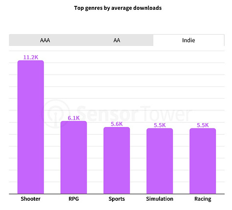 Action, shooters, and RPGs are the most popular genres on PC and consoles by downloads. Sports titles also perform strongly on consoles. On mobile, however, top genres are simulators, arcades, and puzzles, a very different split.