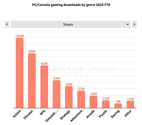 In the AA segment, action and RPGs are the strongest (Clair Obscur: Expedition 33, Kingdom Come: Deliverance II).