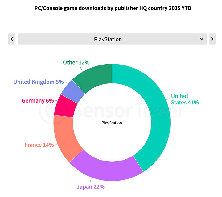 Regionally, US publishers dominate with 38% of all PC/console downloads. Japan holds 15%, and France 10%.