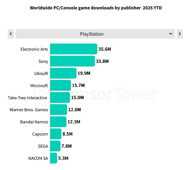 Electronic Arts was the most popular publisher from January to August 3, 2025, with 82.8 million downloads. For comparison, Microsoft had 75.4 million and Sony had 55.4 million. EA’s number will grow by year-end thanks to major sports releases traditionally dropping in late summer–early fall.