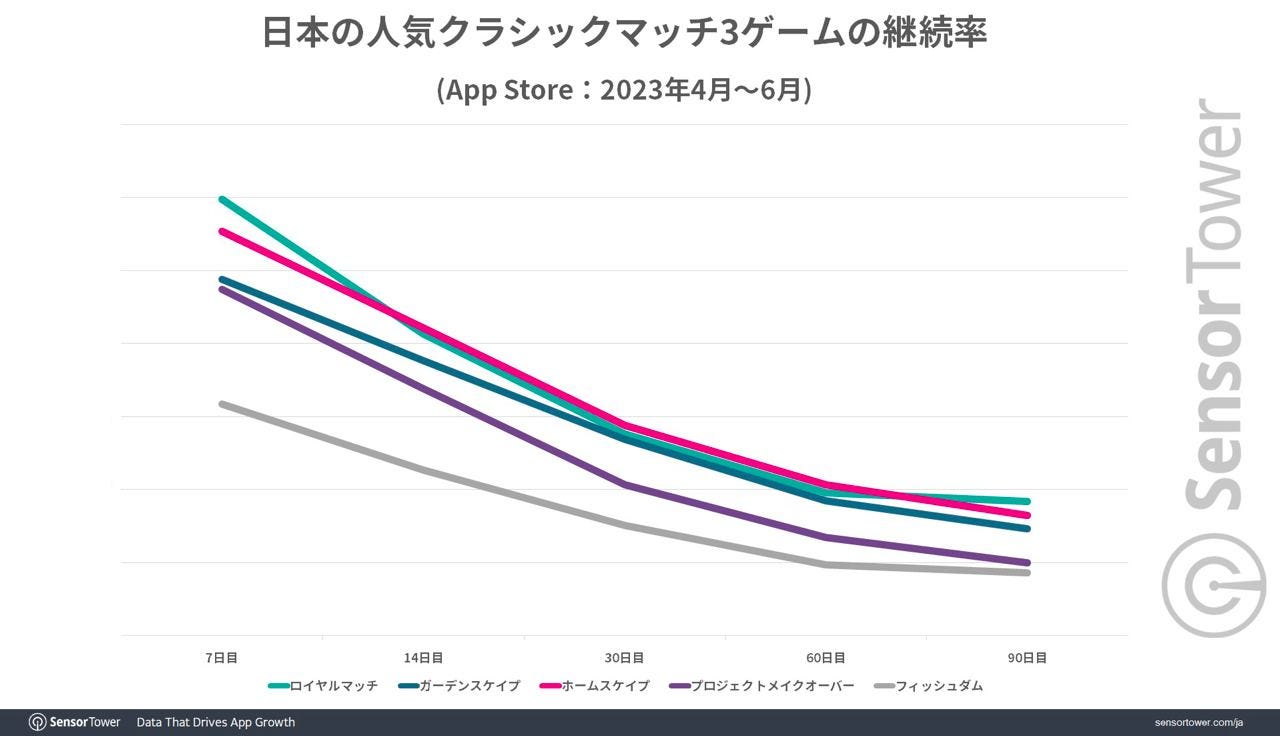 Royal Match has better retention rates than its competitors at 7 and 90 days. Between days 14 and 60, its retention is only surpassed by Homescapes.