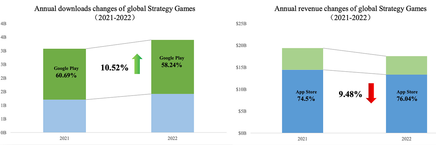 Strategy games - downloads in 2022 increased by 10.52%. Revenue declined by 9.48%.