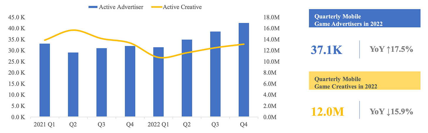 The number of creatives despite growth in all quarters of 2022 was lower than in 2021 by 15.9% (12M creatives).