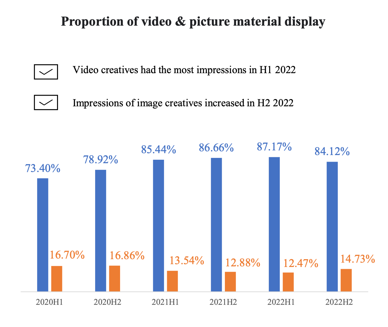 80.76% of all creatives in 2022 are videos. 14% are images. Playables are taking 2.36% of the share. Other creatives SocialPeta put in the “other” section.