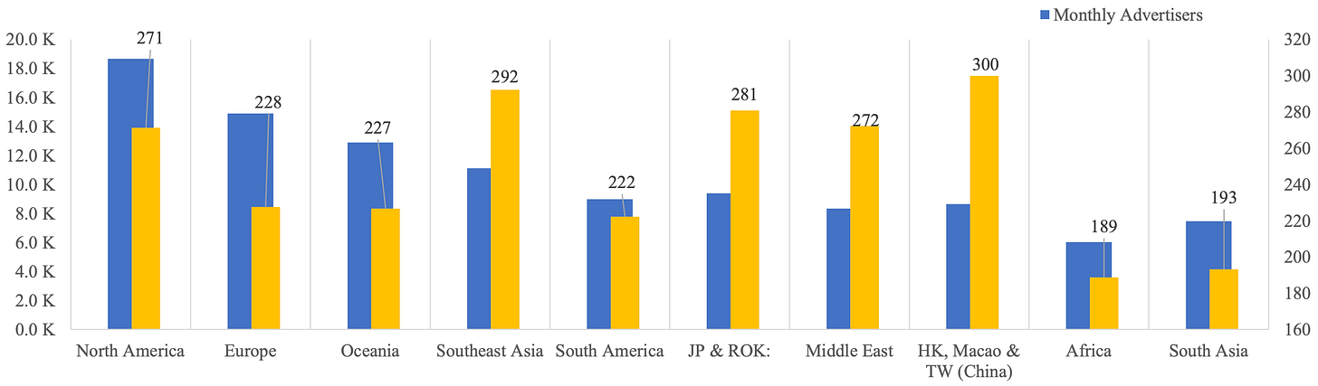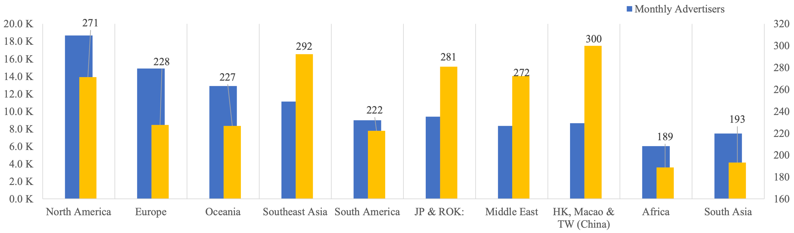 US by the end of 2022 become the leader by a number of advertisers. Asian users saw the most creatives last year.