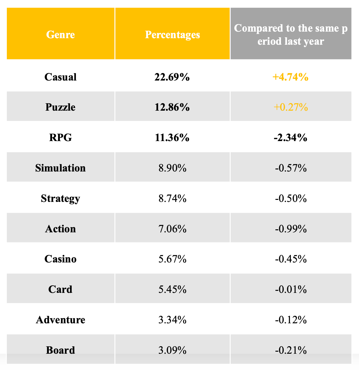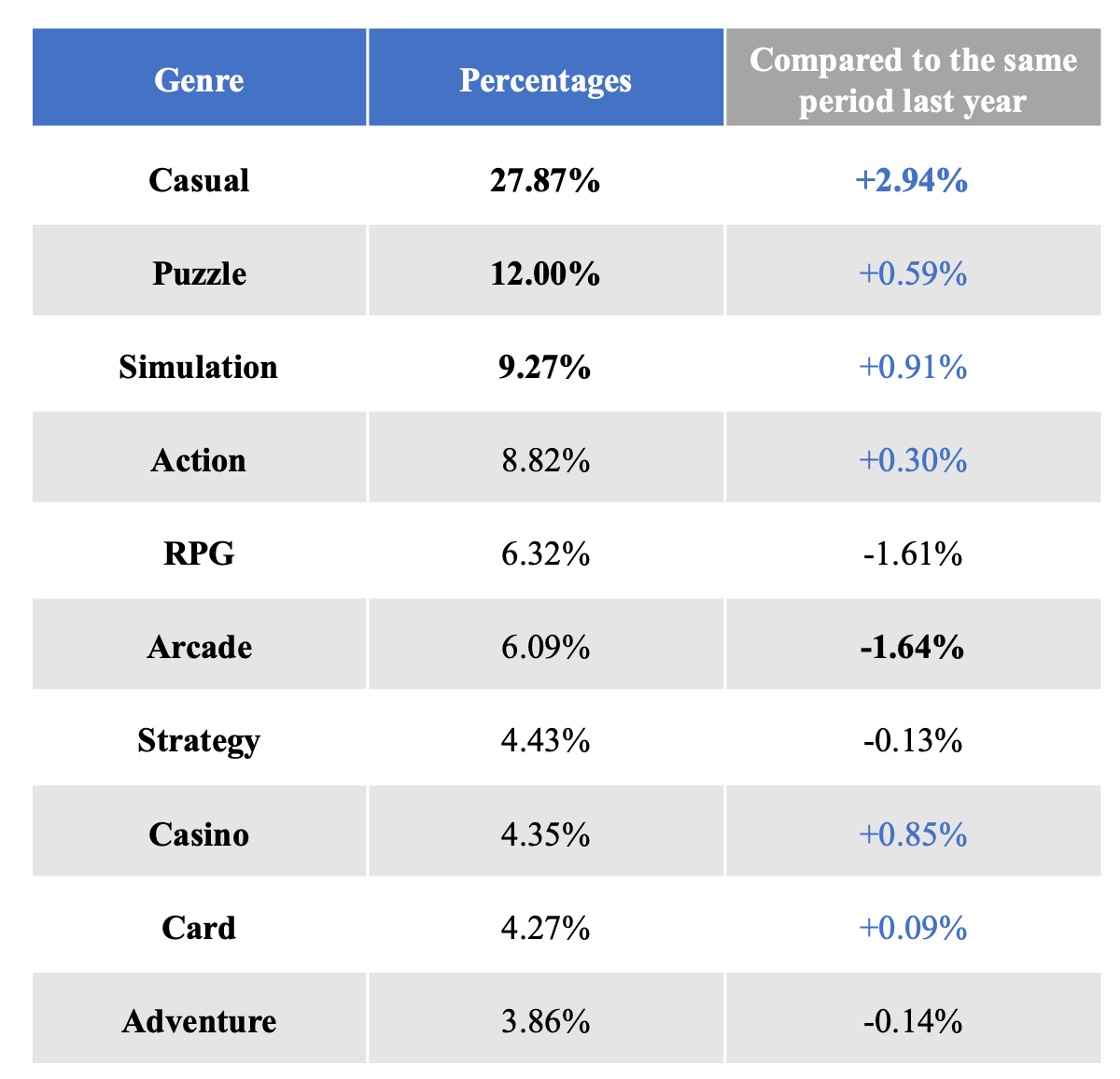 Casual games (22.69%), puzzles (12.86%), and RPG (11.36%) are leaders by the number of creatives.