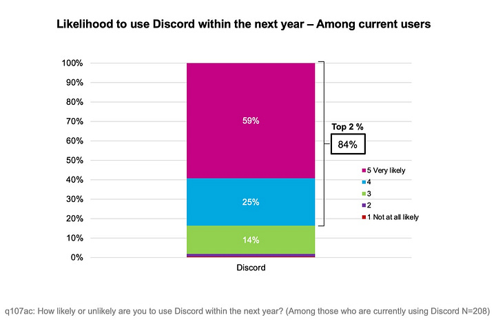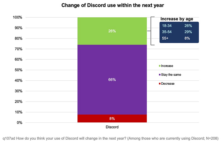 84% of respondents are satisfied with Discord. Loyalty to the messenger is very high. Usage grew 26% among 18–34-year-olds over the past year; 29% among those 35–54; and 8% among those 55+.