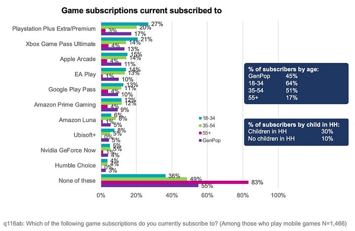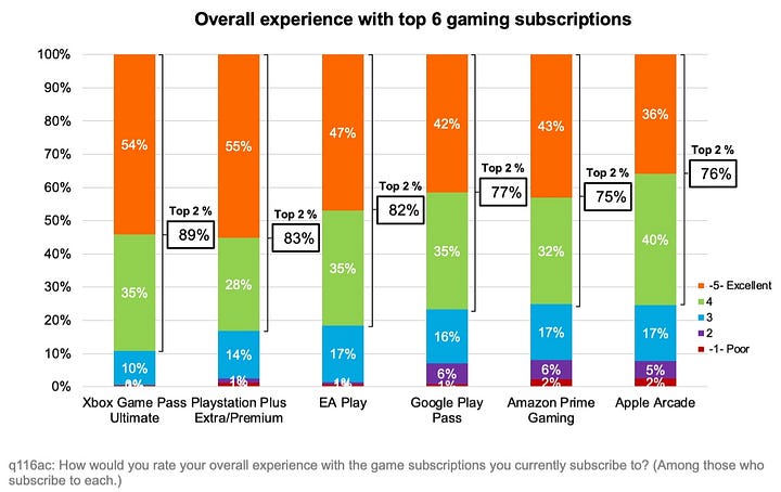 PlayStation Plus, Xbox Game Pass, Apple Arcade, EA Play, and Google Play Pass are the most popular subscription services among U.S. users. Overall, at least three-quarters of their audiences are satisfied.