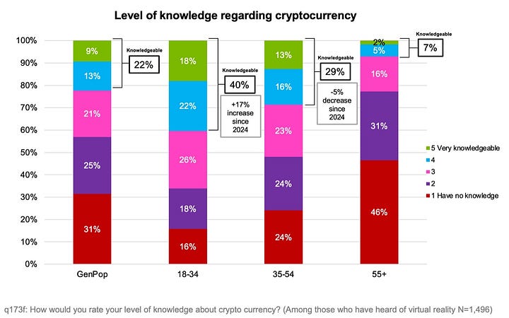 Interest in cryptocurrencies is growing among 18–34-year-olds, while among 35–54 it has declined compared to 2024. 68% of respondents don’t own any cryptocurrency at all.