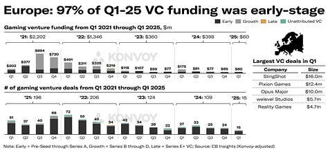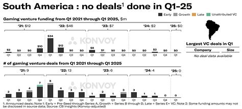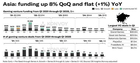 From 2021 to Q1’25, the US outpaced China in gaming venture investment volume by 7.6x. The deal count difference is similar.