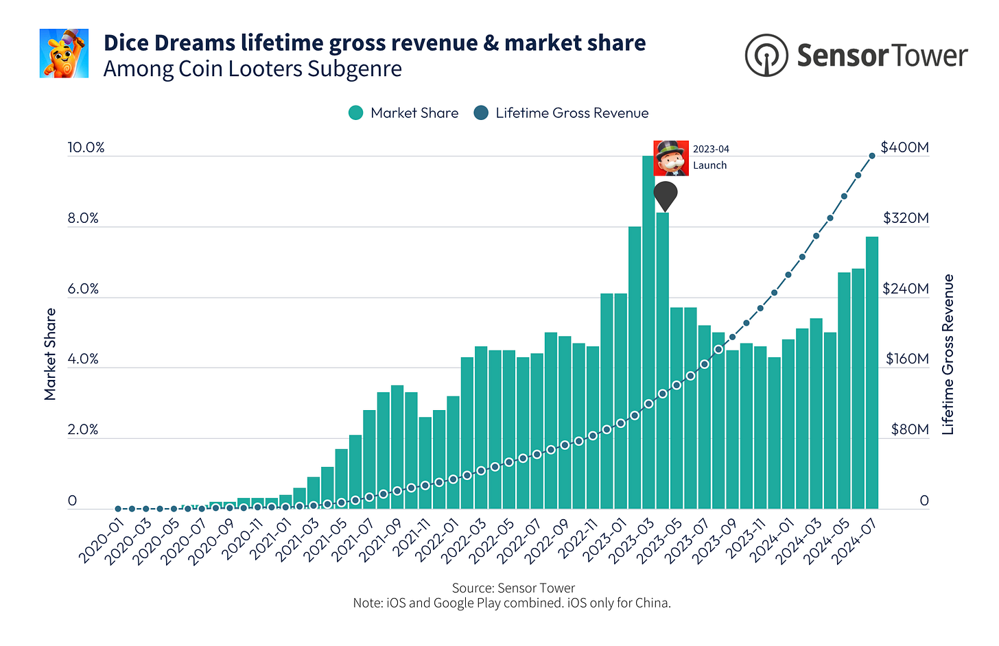 SuperPlay, the creators of Dice Dreams, continue to grow revenue for Domino Dreams. In July, the game made it into the top 100 for revenue on iOS.