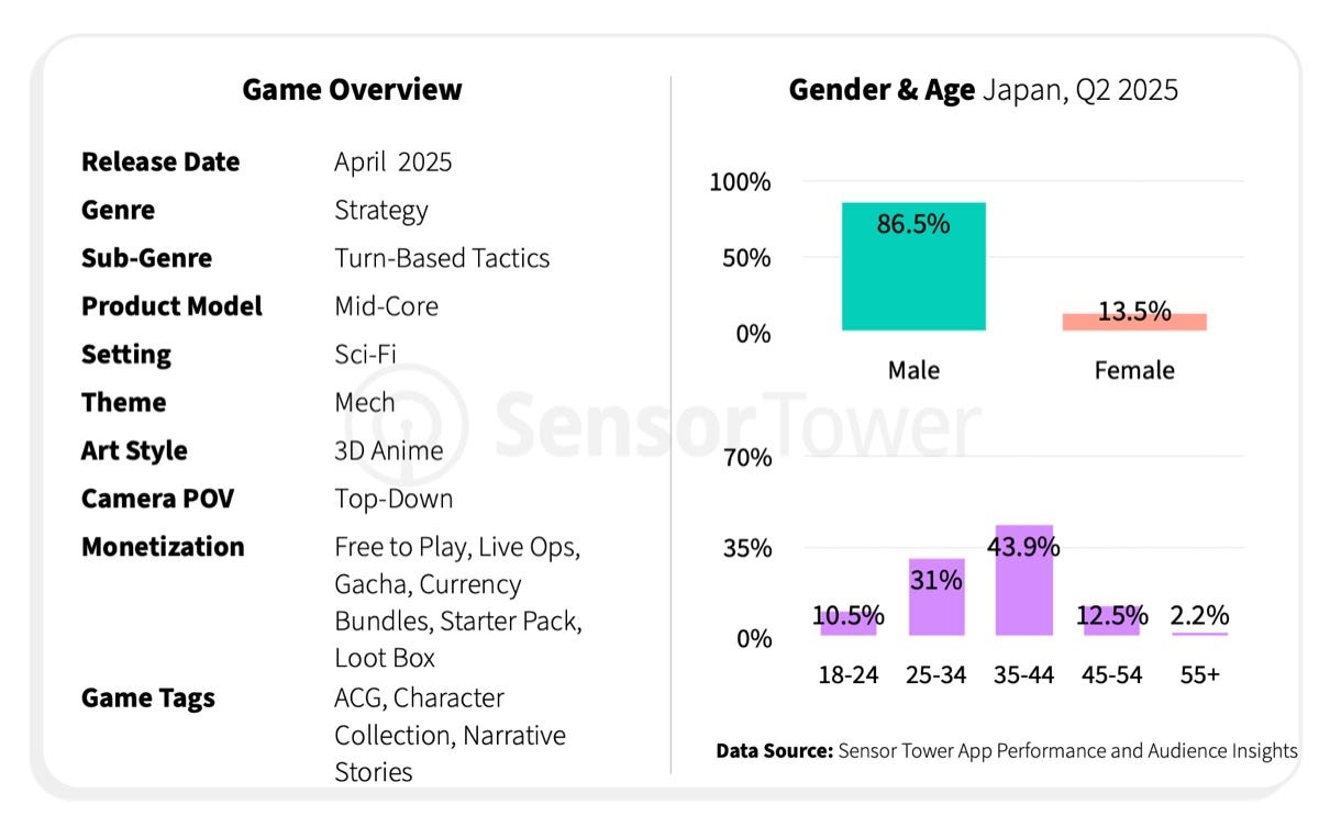 The game launched in April 2025 - it’s a turn-based strategy in a popular franchise. In Q2’25 the game drew an 86.5% male audience; the main age group was 25–44 (74.9%).