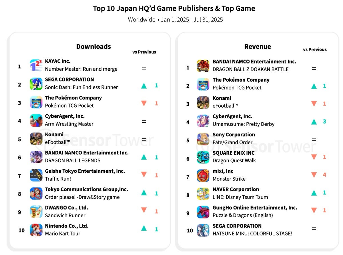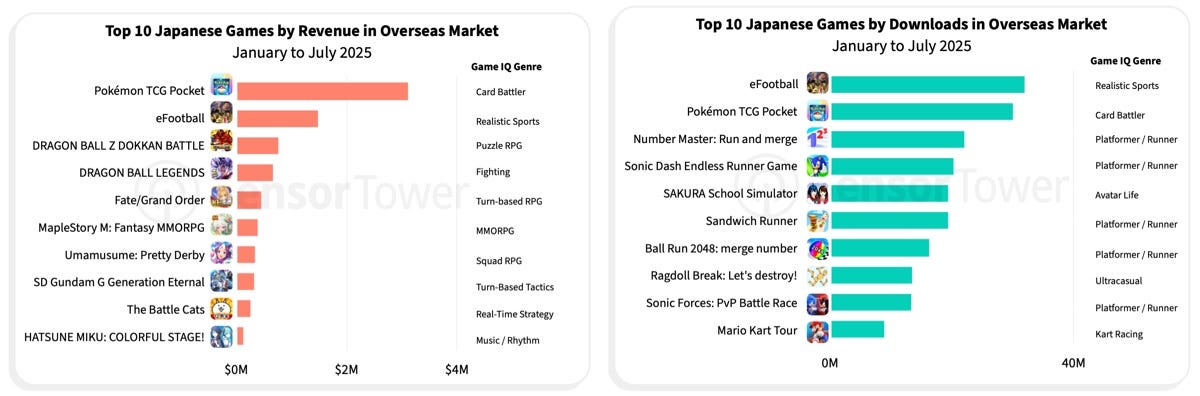 Pokemon TCG Pocket, eFootball and Dragon Ball Z Dokkan Battle are the top three earners from global markets for Japanese publishers. By downloads leaders are eFootball, Pokemon TCG Pocket and Number Master: Run and Merge.