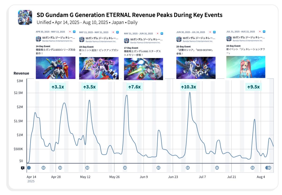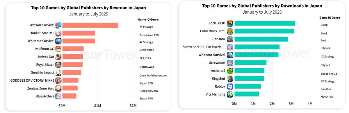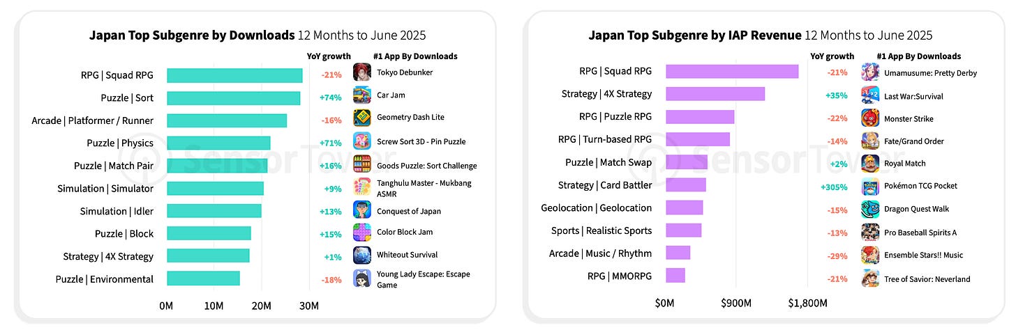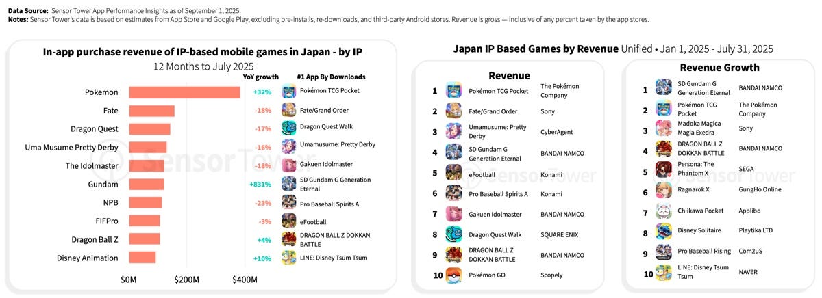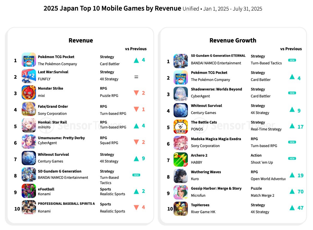 Japanese users remain loyal to their franchises - in 2025, top downloads are Pokemon TCG Pocket and SD Gundam G Generation ETERNAL.