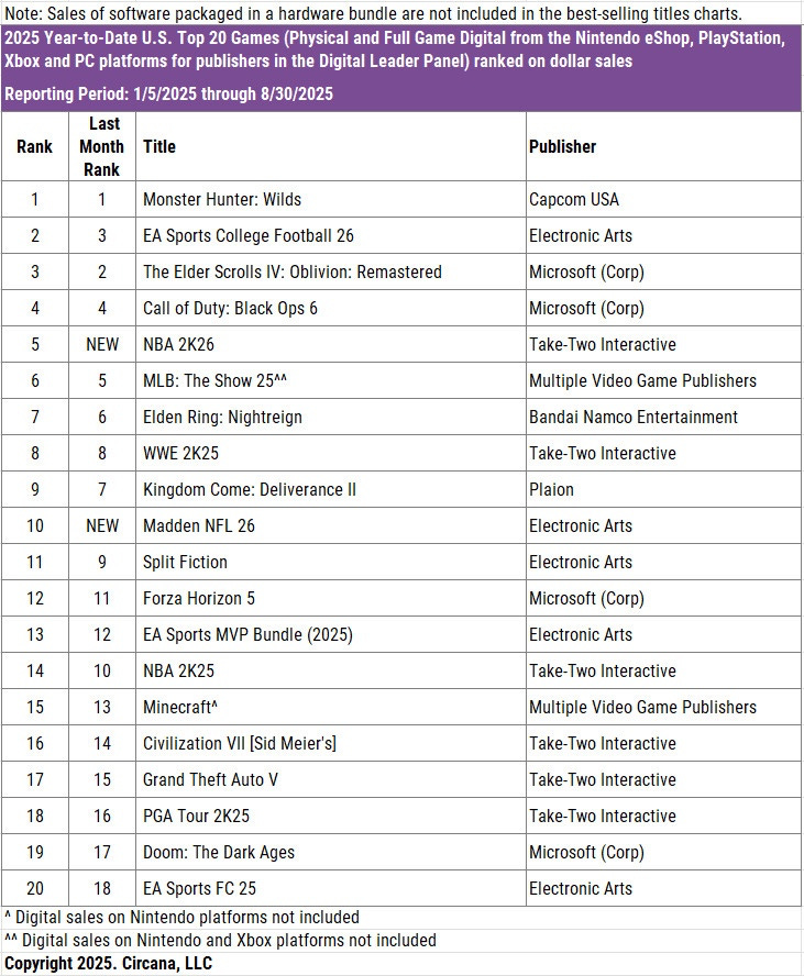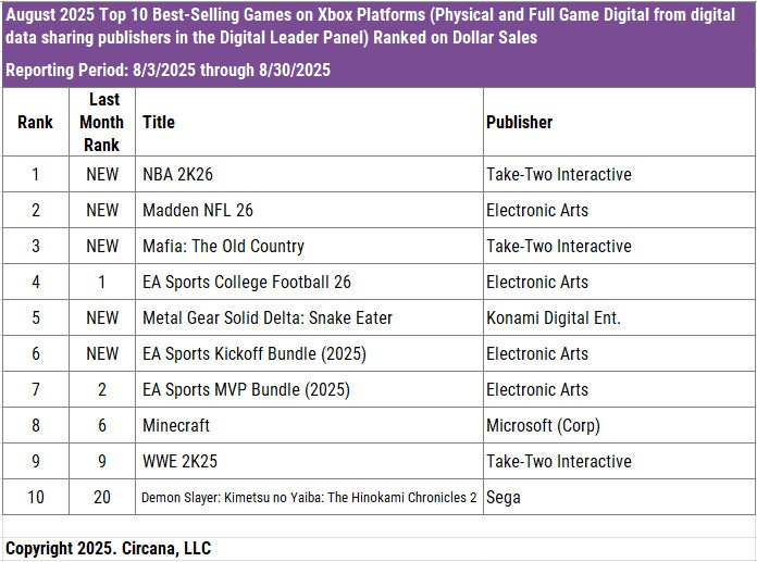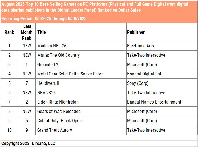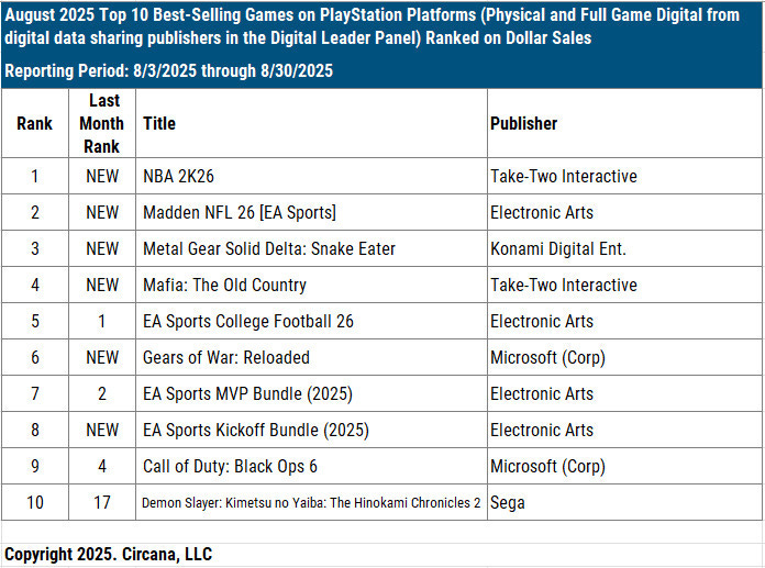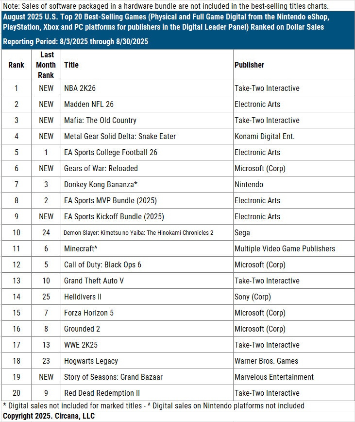 August saw a large number of new releases in the U.S. market. Four of the top five were new titles - NBA 2K26, Madden NFL 26, Mafia: The Old Country, and Metal Gear Solid Delta: Snake Eater.