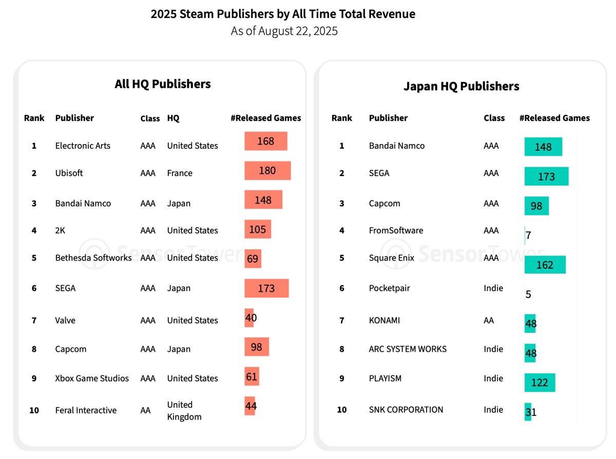 Japan has 3 companies in Steam’s top-10 by revenue — Bandai Namco, SEGA, and Capcom.