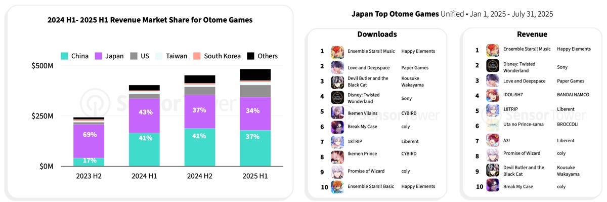 Otome, according to Sensor Tower, refers to games primarily aimed at women, where the core gameplay is focused on building relationships with men. Top downloads: Ensemble Stars!! Music, Love & Deepspace, and Devil Butler and the Black Cat. Top revenue: still Ensemble Stars!! Music, plus Disney: Twisted Wonderland and Love and Deepspace.
