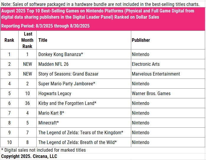 Sports games performed well even on the Nintendo Switch 2 - Madden NFL 26 was second only to Donkey Kong Bananza in sales. Story of Seasons: Grand Bazaar also had a solid launch.