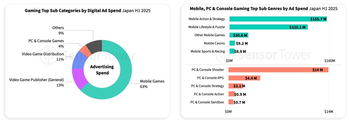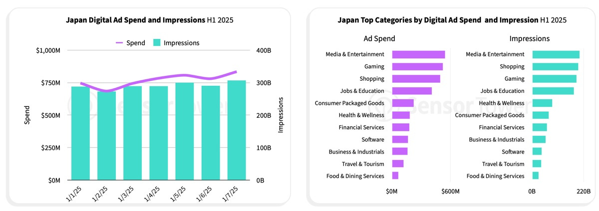 In the first half of 2025, digital ad spend in Japan was about $750 million per month. Games were second after media and entertainment in spend, and third by overall reach.
