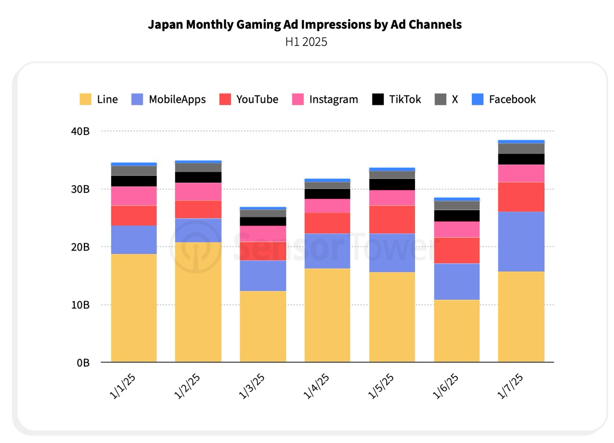 Line, other mobile apps, and YouTube were the main sources of game ad reach in early 2025.