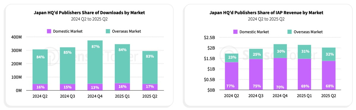 Looking only at Japanese publishers, domestically they earn 68–69% of all IAP revenue (in the first two quarters of 2025), while accounting for just 16–17% of all installs.