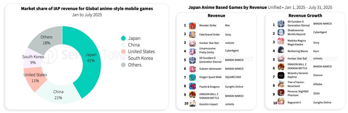 Japan is the home of anime, and Japanese games account for 42% of all global anime-style game revenue (from January to July 2025). Notably, the share of Chinese projects is half of this amount.