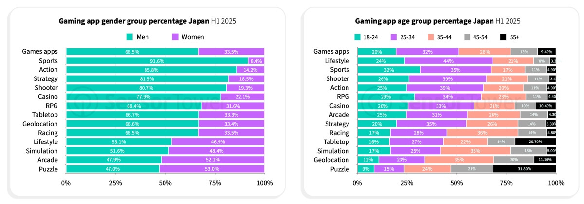 Players aged 25–34 in Japan more often prefer competitive titles (sports, shooters, action, RPGs). The share of older players (35 and up) is higher in more casual projects.
